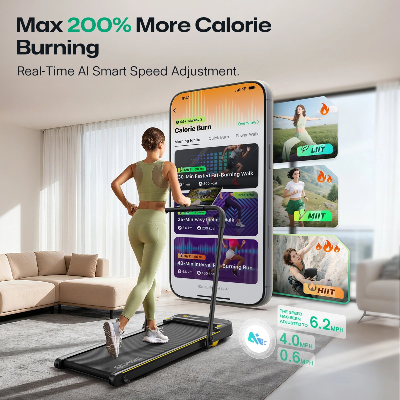 - 2-In-1 Under Desk Treadmill: Open running mode 0.6-6.2mph, folding walking mode 0.6-4mph., can be adjusted according to your needs. Not only for running, but also for use under your desk. And equipped with a remote control with a one-key to eliminate the prompt sound function for easy adjustment, and the back of the remote control is equipped with magnets, which can be attached to the treadmill to prevent loss when not in use.